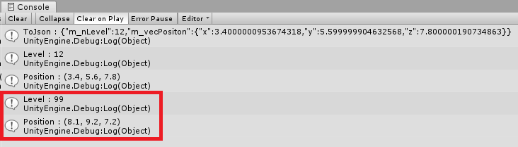 Json형식의 데이터를 다시 오브젝트 형으로 변환할 때는 다음과 같이 JsonUtility.FromJson 메서드를 사용하면 됩니다.