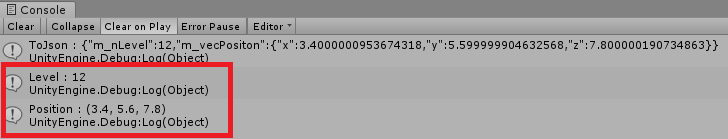 그 뒤 JsonUtility.FromJson<Data>(str2)을 통해 json형식의 데이터를 변환하고 출력합니다.
