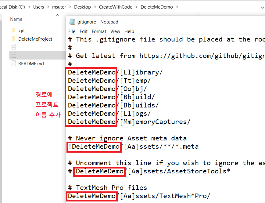 Github Desktop "warning: LF will be replaced by CRLF" 유니티 프로젝트를 만들고 버전 업데이트를 위해 커밋을 하던 중 다음과 같은 오류가 나타났습니다. https://answers.unity.com/questions/1668898/github-desktop-warning-lf-will-be-replaced-by-crlf.html Github Desktop "warning: LF will be replaced by CRLF" - Unity Answers answers.unity.com 링크의 답변에 따르면 프로젝트 폴더의 .gitignore로 들어가 위와 같이 파일 경로 앞에 자신의 프로젝트 이름을 추가한 뒤 다시 커밋을 진행하면 오류없이 잘 진행됩니다.